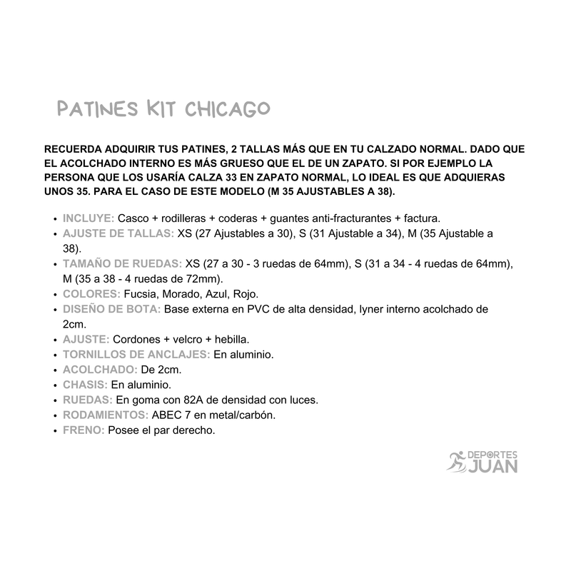 RECUERDA ADQUIRIR TUS PATINES 2 TALLAS MÁS, QUE EN TU CALZADO NORMAL. DADO QUE EL ACOLCHADO INTERNO ES MÁS GRUESO QUE EL DE UN ZAPATO. SI POR EJEMPLO LA PERSONA QUE LOS USARIA CALZA 29 EN ZAPATO NORMAL, LO IDEAL ES QUE ADQUIERAS UNOS 31. PARA EL CASO DE ESTE MODELO (S 31 AJUSTABLES A 34).