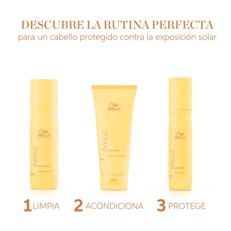 Momento de aplicacion en la rutina | 1. Paso 2 – Usar después del shampoo Invigo SunCare, ideal después de la exposición solar, en la rutina de cuidado post-verano o piscina. |