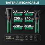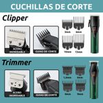 TRIMMER Material del cuerpo: ABS Material de la cuchilla: Hoja de cerámica y titanio Bateria: 2000 MAH Potencia: 5W Velocidad: 6000 RPM Tiempo de carga: 2.5hr Tiempo de uso: 240 Minutos 4 Peines de corte: 1.5/3/6/9mm Recorta a 0