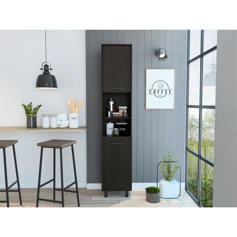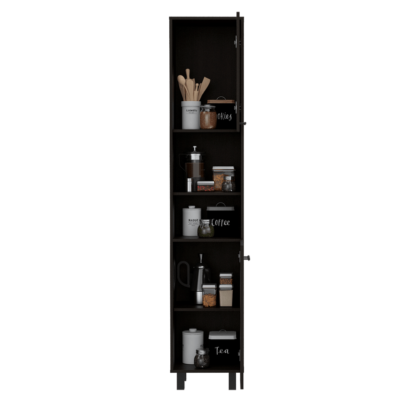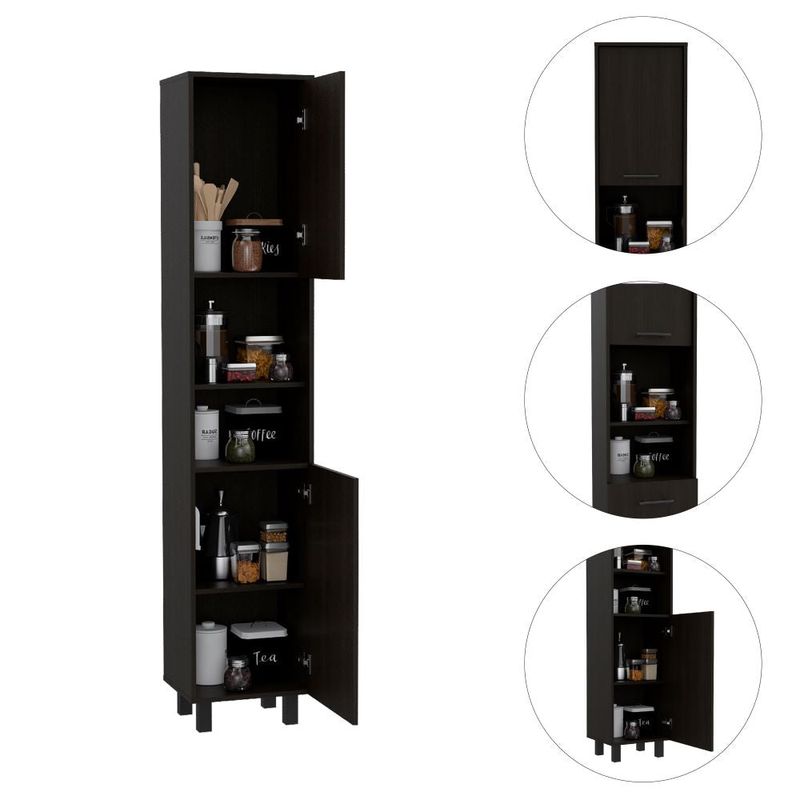 Alacena, variedad de entrepaños, espacio para microondas, 2 puertas batientes, manijas y patas metálicas.