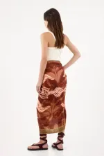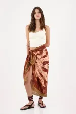 Fit & Styling Envolvente de largo midi. Llévalo a la cadera con el nudo hacia la izquierda para estilizar la línea delantera. Combínalo con un top de canalé en tono crudo y deja que el estampado sea el protagonista: look fresco para días de ciudad, tardes de terraza o escapadas cercanas.