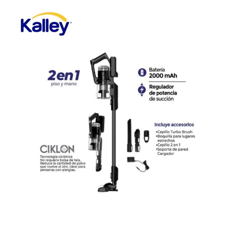 Mantén tu hogar impecable con la Aspiradora Inalámbrica Kalley 2 en 1, diseñada para ofrecerte practicidad, potencia y comodidad en cada limpieza. Gracias a su tecnología ciclónica, reduce el polvo que vuelve al aire, siendo ideal para personas con alergias.