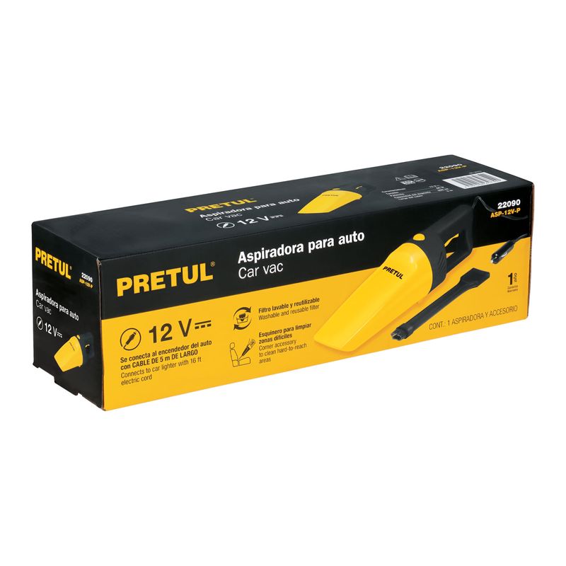 Aspiradora para auto, de 12 volts, Pretul • Filtros lavables y reutilizables • Uso con sólidos • Escobilla y conector para tomacorriente del auto Especificaciones Potencia 60 W Tensión 12 V (C.D) Capacidad del depósito 600 ml Largo de cable 5 m (16.4 ft) Incluye Boquilla para ranuras Filtro lavable y reutilizable