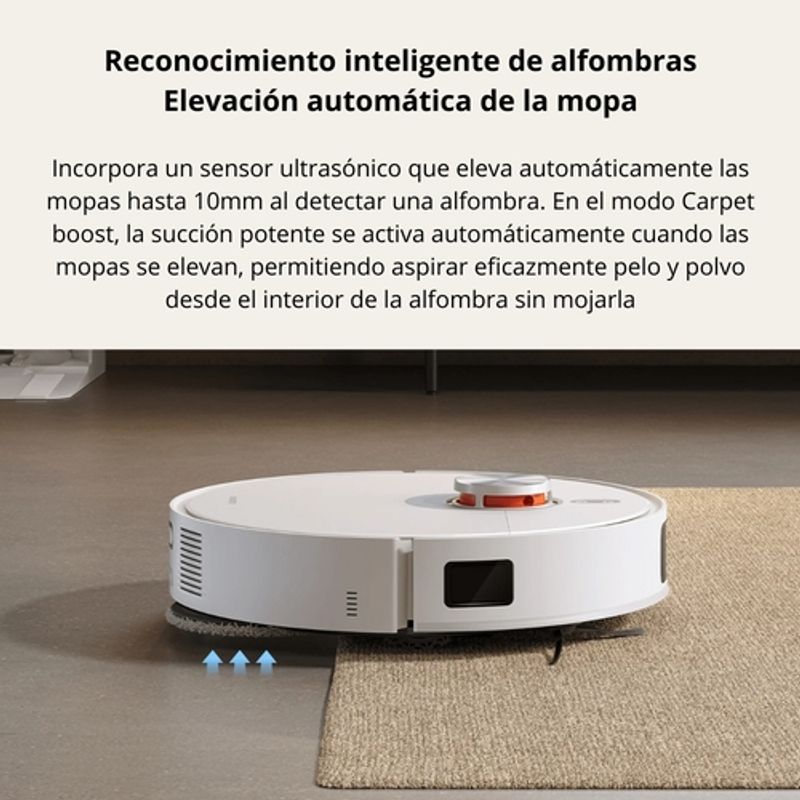 Cuenta con dos mopas giratorias de alta velocidad que mejoran la eliminación de manchas en pisos duros. El sistema de reconocimiento de alfombras eleva automáticamente las mopas y activa el aumento de succión, protegiendo las superficies textiles.