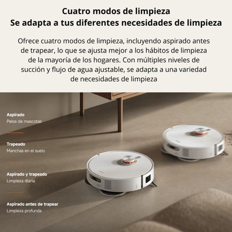 El ventilador de succión de 7000 Pa permite recoger eficazmente polvo, residuos y cabello. A través de la app es posible elegir entre cuatro niveles de succión según el tipo de superficie y el nivel de suciedad, logrando una limpieza precisa y adaptable.