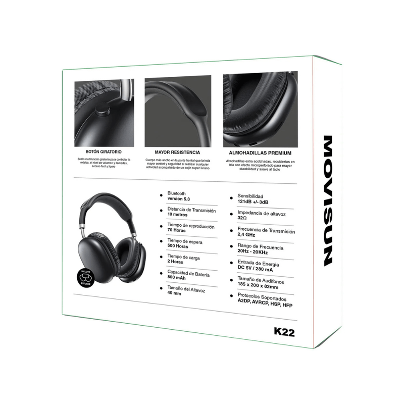 Descubre los Audífonos Bluetooth K22 Movisun, diseñados para ofrecerte una experiencia auditiva excepcional con hasta 70 horas de reproducción continua.
