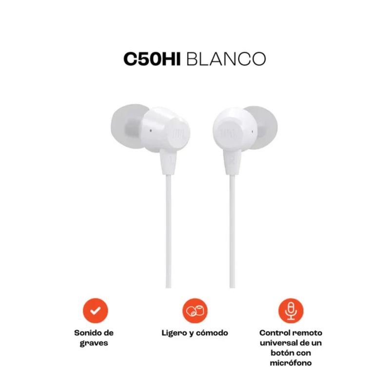 Los JBL C50HI Blancos son unos Audífonos Alámbricos internos dinámicos y ultraligeros que ofrecen la respuesta de graves y la calidad de sonido legendaria que esperas. A pesar de su potente rendimiento de sonido, son livianos como una pluma para brindar comodidad durante todo el día.
