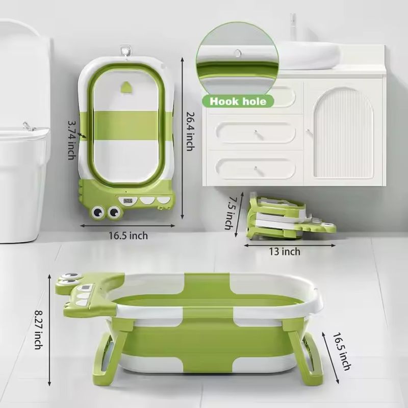 Diseño innovador de doble plesta: nuestra bañera para bebés cuenta con un diseño doble plegado que ahorra espacio, que mide menos de 4 pulgadas de espesor. Esto permite un fácil almacenamiento en espacios ajustados y mejora la portabilidad, perfecta tanto para el uso del hogar como para los viajes. El drenaje fuera del piso con un tapón de goma fácil de usar garantiza un drenaje de agua sin problemas sin la necesidad de reubicación. * Monitoreo avanzado de temperatura en tiempo real: equipado con un sensor de temperatura de vanguardia, nuestra bañera para bebés de viaje ofrece un monitoreo visible de temperatura en tiempo real. Los recordatorios instantáneos ayudan a prevenir el escalado o la exposición al agua fría. El sistema de bloqueo de temperatura envolvente garantiza un monitoreo preciso, lo que lo hace versátil para su uso en casa, durante los viajes de viaje o de campamento. * Materiales seguros premium: elaborado con materiales PP+TPE de alta calidad, nuestra bañera de bebé prioriza la seguridad, la durabilidad y la tranquilidad. Odorado y resistente a la mordida, no asegura que no hay daño a su bebé. El diseño estable de soporte de cuatro esquinas en la parte inferior mejora la estabilidad estructural, minimizando los riesgos de vuelco. * El relleno cómodo con un cojín desmontable: nuestra bañera de bebé para recién nacidos presenta un cojín desmontable colgante que proporciona un soporte óptimo para la delicada cabeza y el cuello. El suave cojín