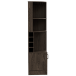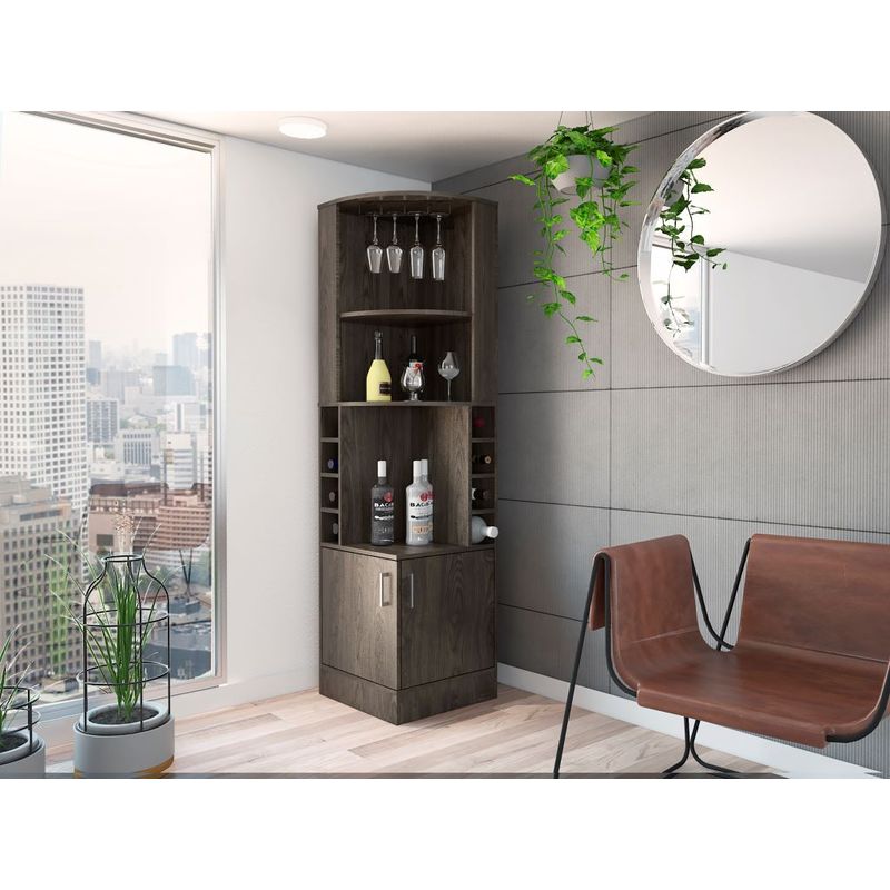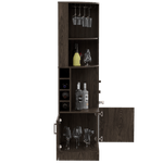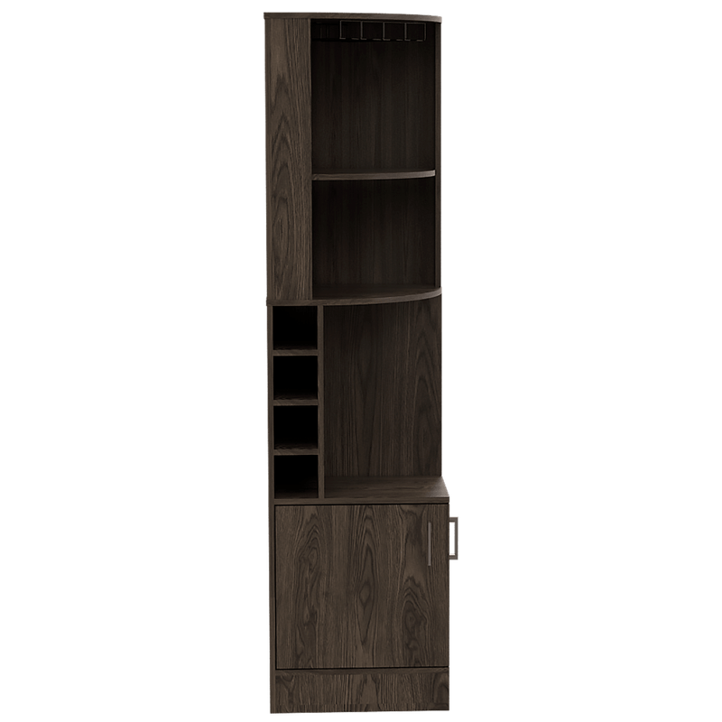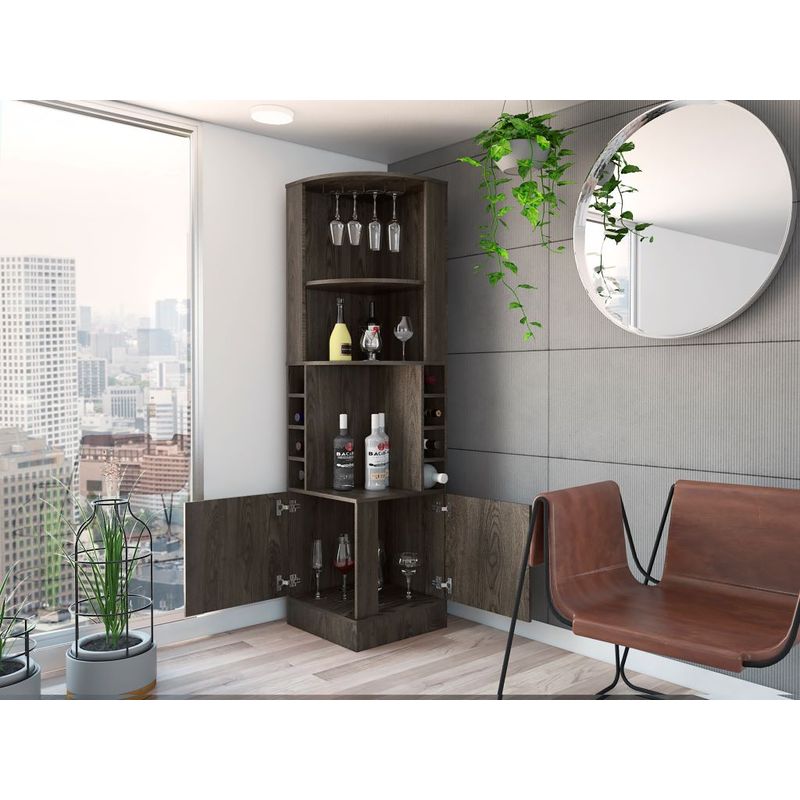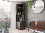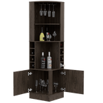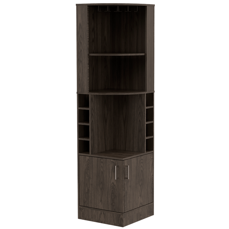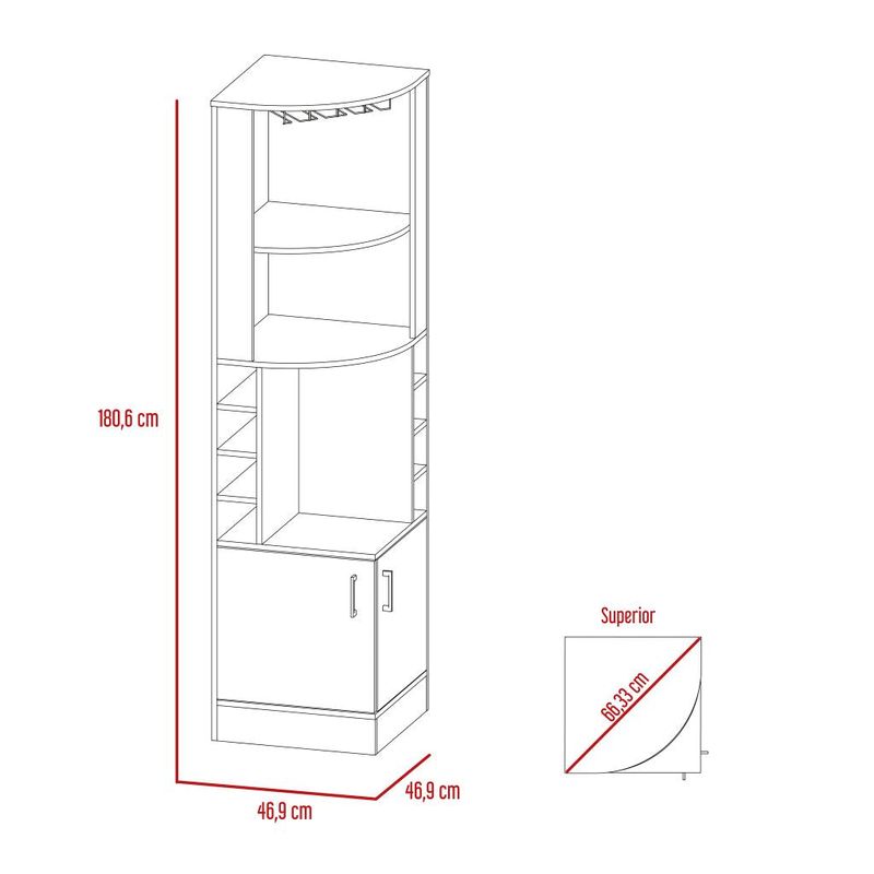 Bar Esquinero, con 4 de entrepaños, 2 puertas batientes, porta copas y amplio espacio para almacenar botellas. Elaborado en Madera aglomerada MDP, recubierta con láminas melamínicas de excelente calidad, en color Chocolate. Sus medidas son: Alto: 180,6 cm Ancho: 46,9 cm Fondo: 46,9 cm El tiempo de entrega de este producto es de 3 a 8 días hábiles. Su garantía es de 3 años en madera y 1 en herrajes. Pregunta ya por nuestro servicio de armado y envío gratis. Importante: Este producto no incluye elementos decorativos ni ambientación.