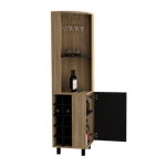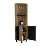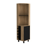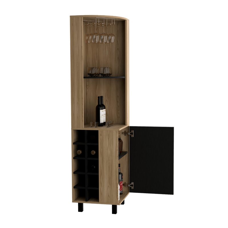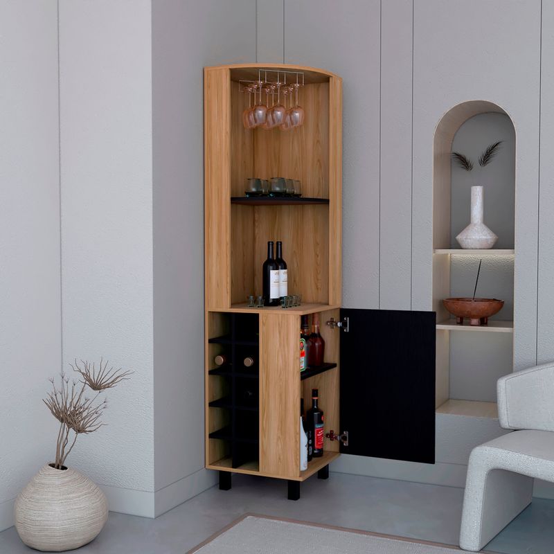 Bar esquinero con espacio superior para almacenar copas de vino, espacio para organizar licores, patas metalicas en acero negro con medidas de: ALTO 180 ANCHO 45 FONDO 45