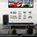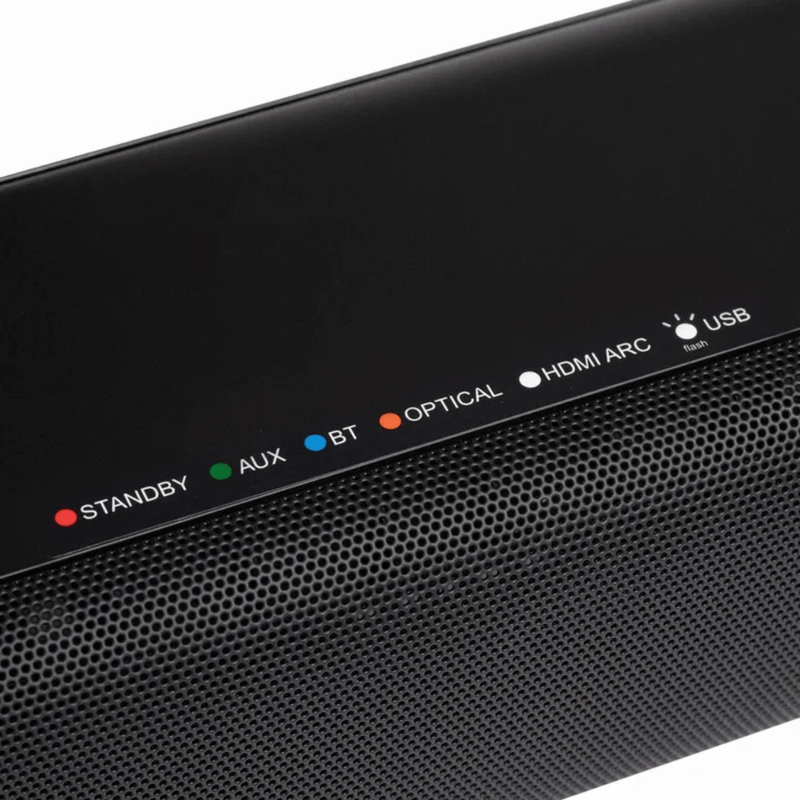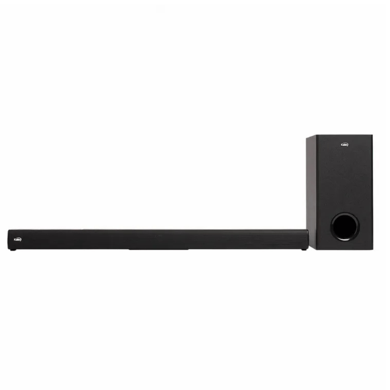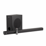 Barra de sonido 2.1 canales con potencia total de 120 W, subwoofer inalámbrico, Bluetooth, HDMI ARC y óptico digital para audio de alta fidelidad.
