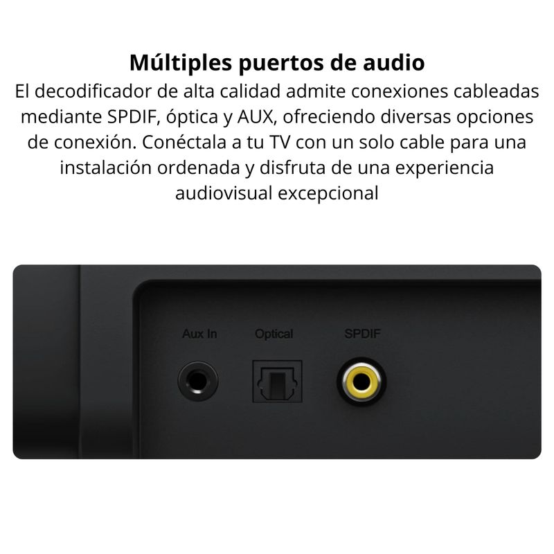 El decodificador de alta calidad admite conexiones cableadas mediante SPDIF, óptica y AUX, ofreciendo diversas opciones de conexión. Conéctala a tu TV con un solo cable para una instalación ordenada y disfruta de una experiencia audiovisual excepcional.
