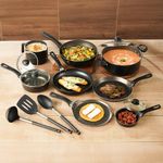 Batería momento toda ocasión llega para acompañar tus mejores momentos, esta compuesta por: Sartén 24 cm, wok 24 cm, plancha asadora 23 cm, olla 24 cm + tapa de vidrio, perol 16 cm + tapa de vidrio, cacerola 12 cm mango + tapa de vidrio, parilla de arepas antiadherentes, jarro lechero + tapa de vidrio, accesorio pala esencial, accesorio cuchara esencial, accesorio cucharon esencial.