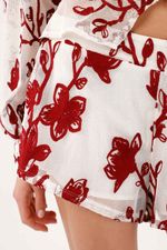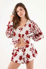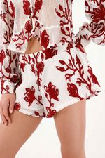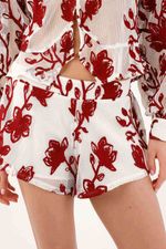 Flores que se mueven contigo. Un estampado botánico rojo sobre fondo blanco convierte esta bermuda en una declaración fresca y urbana. La pierna con vuelo y el bajo curvo aportan movimiento visual y un efecto favorecedor al caminar; el fit relajado suma comodidad y una vibra effortless. La textura del tejido resalta el dibujo y le da carácter. Exterior en poliéster para un look pulido y forro de algodón que se siente natural sobre la piel.
