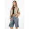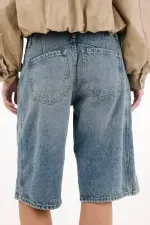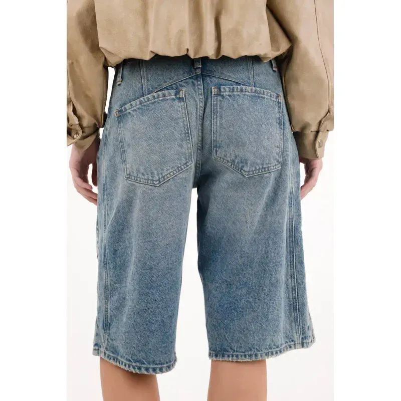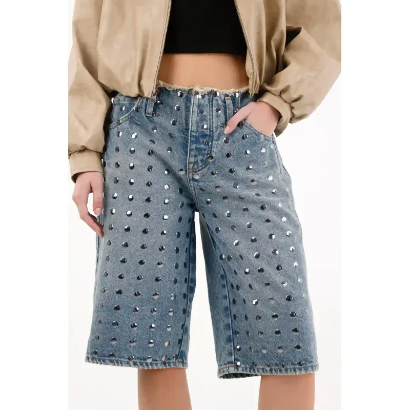 Esta bermuda larga en denim lleva el espíritu rebelde del street style a otro nivel. Los taches metálicos añaden ese toque rocker que transforma cualquier look básico en un statement. Úsala con una camiseta cropped y botas para un outfit con carácter o con una camisa oversize para equilibrar lo edgy con lo effortless.
