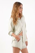 Esta bermuda captura la esencia fresca de la ciudad con un borde calado que roba miradas: un detalle artesanal que enmarca la pierna y suma ligereza visual. El tejido de viscosa aporta una caída fluida y una superficie levemente texturizada que se siente actual, mientras el color verde salvia pone el toque natural que combina con todo. La cintura elástica fruncida se adapta sin complicaciones para un día en movimiento y los bolsillos laterales te dan ese gesto relajado y funcional que define el estilo TNS.