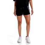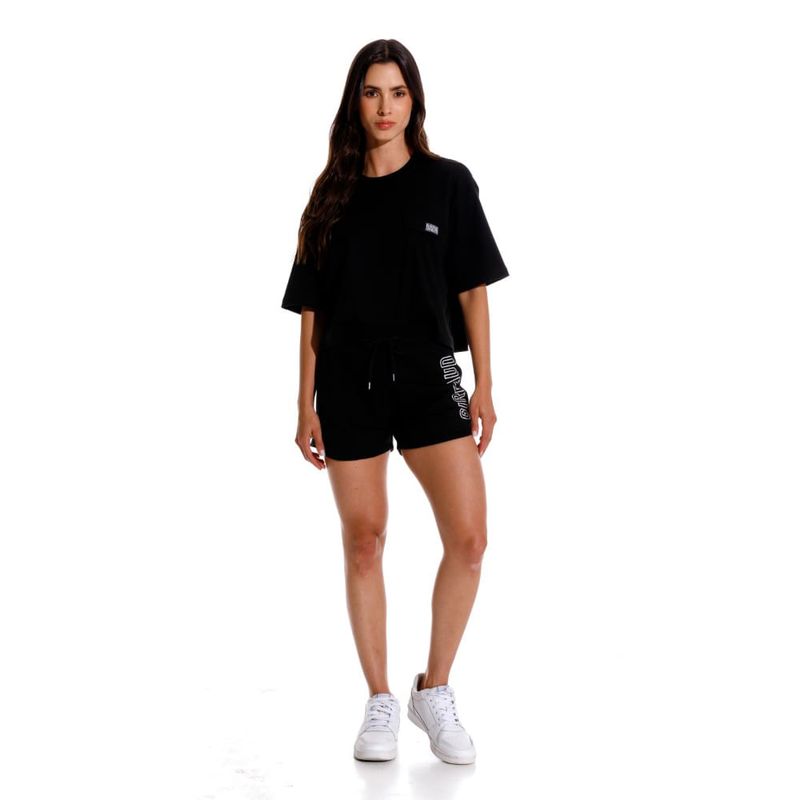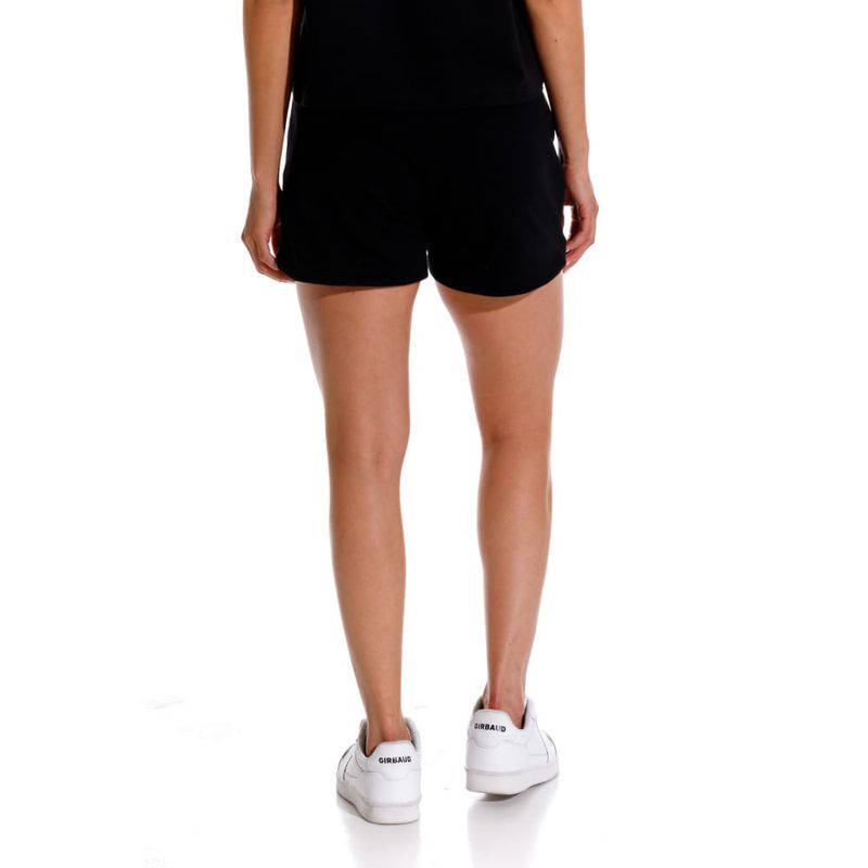 Bermuda en burda de cintura elástica ajustable con cordón. Confeccionado en mezcla de algodón de 270gr. Estampado en pierna izquierda prenda puesta.