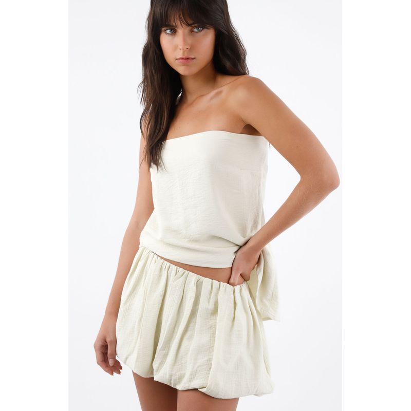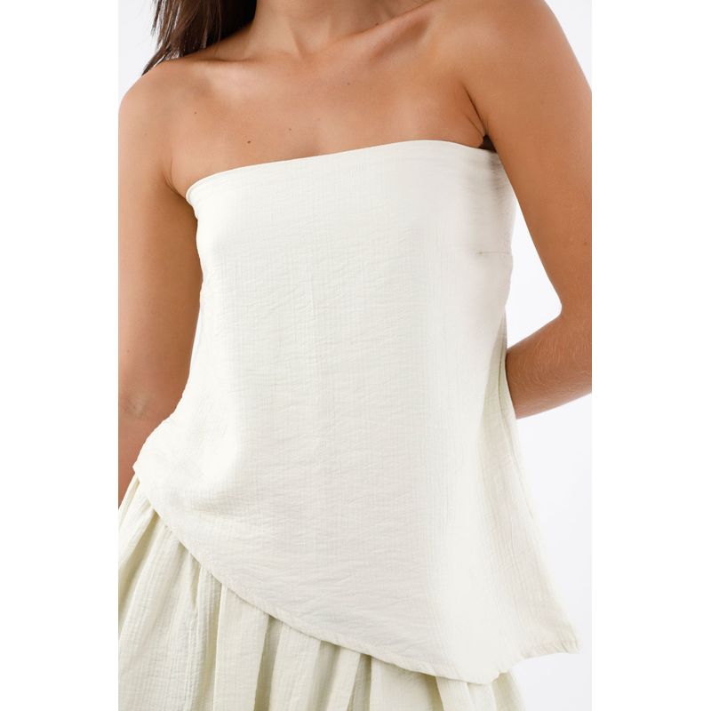 Esta blusa strapless para mujer de TNS juega con una textura arrugada visible en un tejido de viscosa con poliamida. El escote recto despeja el cuello y enmarca los hombros para un efecto limpio; el bajo asimétrico dibuja una diagonal que alarga la silueta y suma movimiento; el tono marfil aporta luz y combina con todo. Su fit relajado acompaña el cuerpo sin marcar, perfecto para un ritmo casual y creativo.