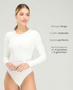 Body de manga larga con cuello redondo, diseñado para ajustarse al cuerpo de manera perfecta. Su corte limpio en las piernas lo hace ideal para no marcarse debajo de las prendas. Cuenta con una abrochadura de 4 puestos y dos ganchos, proporcionando un ajuste seguro. Además, tiene un refuerzo en algodón 100% para mayor confort y frescura. Es una prenda cómoda y versátil que te permitirá usarla de la manera que prefieras. ¡Se convertirá en un básico infantable en tu closet