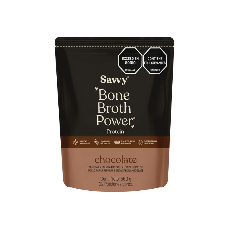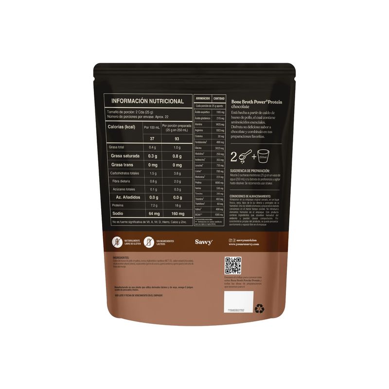 Componentes | Caldo de hueso de pollo en polvo, cocoa, triglicéridos caprílicos MCT C8, sabor natural (chocolate), edulcorante natural (stevia), espesantes (goma de acacia, goma xantana y goma guar) y extracto de fruto del monje. |