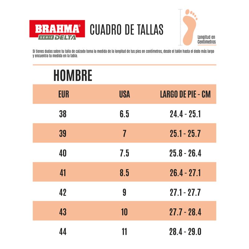 BIENVENIDO A LA TIENDA OFICIAL DE BRAHMA Somos Cauchosol SAS, distribuidor autorizado de la marca Brahma. En BRAHMA creamos calzado con el estilo de vida de los verdaderos aventureros. Nueva línea Serie Delta. Calidad que conoces, al alcance de todos. Ideal para satisfacer las necesidad básicas de uso de tu calzado preferido Brahma. Tipo de plantilla: Termoformada Acabado: Mate/Textil Tipo de Construcción: Montado Forro: Textil Material: Micropiel/Mesh/Tpu Protección a agua: No Sistema de ajuste: Cordon / Lace Loop / Speed Hook Suela: Caucho / Eva TECNOLOGÍAS: Ripple Effect: Suela liviana y flexible con diseño de canales transversales que absorben el impacto. GARANTÍA: Nuestros productos cuentan con garantía de 90 días calendario siguiente a la fecha de compra, por condiciones de idoneidad del producto, calidad y/o seguridad legalmente exigibles. Aún así, nuestro producto no es indestructible y por lo tanto nuestra garantía no cubre daños causados por abuso, maltrato, uso inadecuado y/o desgaste por uso normal. El fabricante tendrá el derecho en los casos que aplica la garantía extendida a reparar o reponer el producto. El tiempo de respuesta será de máximo 15 días hábiles posteriores a la solicitud. El producto para garantía se debe presentar en perfectas condiciones de limpieza al momento de ser entregado.