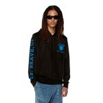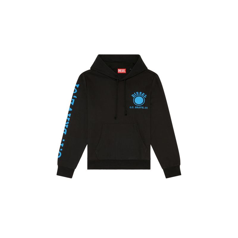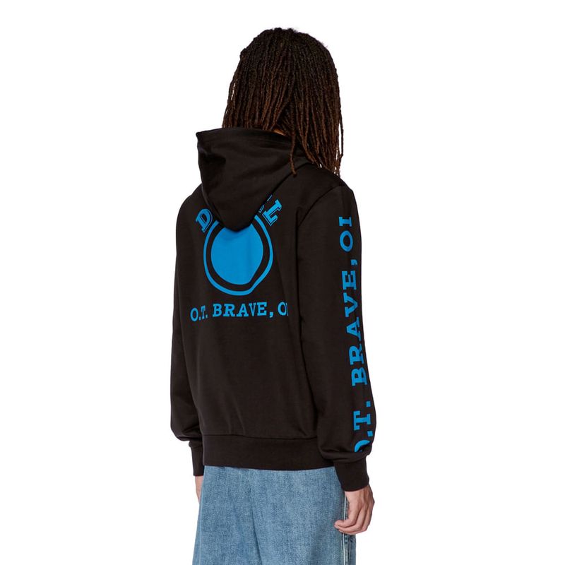 Sudadera con capucha con diseño de líneas puras, confeccionada en French Terry ligero. El modelo tiene fit regular y presenta estampados al agua Diesel OT Brave de temporada en el pecho, la parte trasera y la manga. • Composición: 60%Algodón 40%Poliéster, Elástico 95%Algodón 5%Elastano • País Origen: Bangladesh • El modelo viste una talla L y mide 182 cm