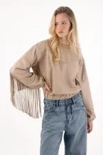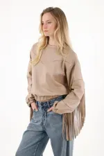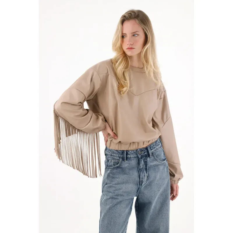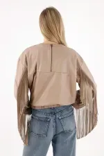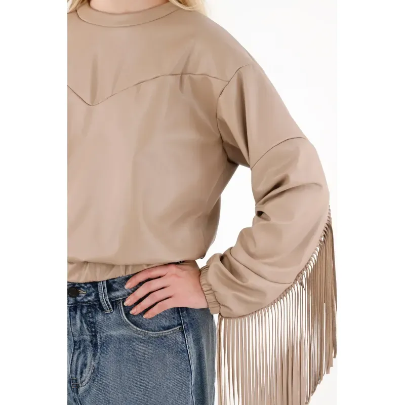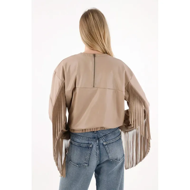 Confeccionado en cuero sintético suave de tonalidad clara. Su almilla frontal y las mangas con flecos crean un juego visual lleno de ritmo, mientras el diseño reversible te permite llevar el cierre en el cuello al frente o atrás, según el mood: más atrevida, más minimal, o más experimental.