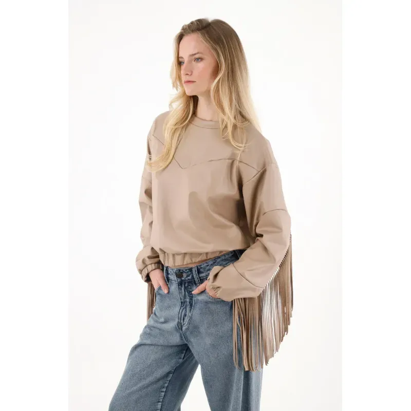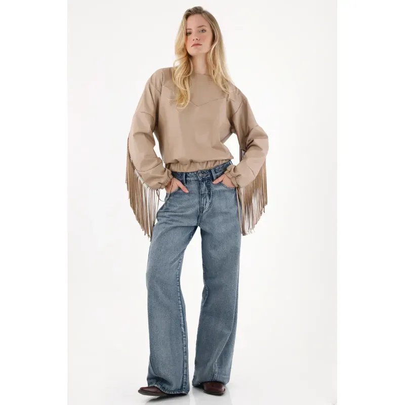 Este buzo en cuero sintético café mezcla esa vibra western con un toque urbano. Funciona perfecto con jeans rectos, botas o incluso sobre vestidos para un look cowboy-chic de temporada.