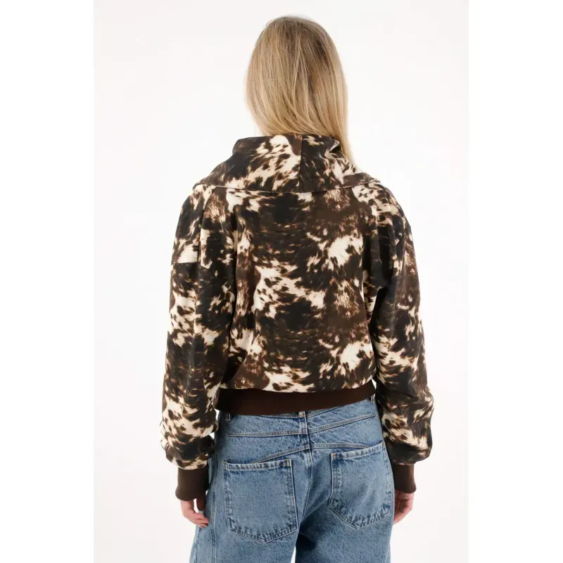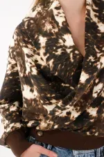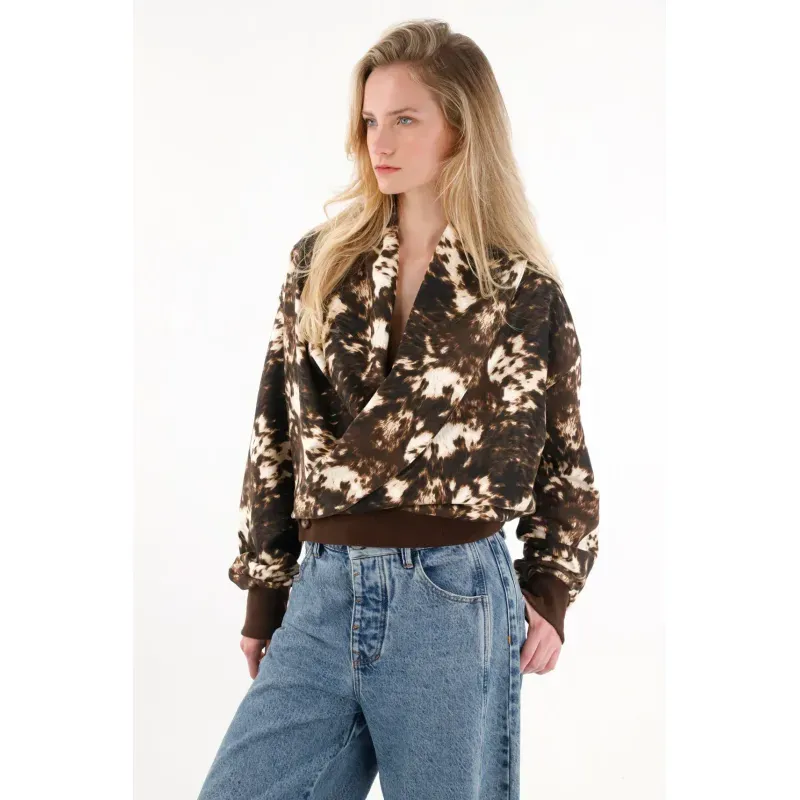 Este buzo para mujer está diseñado en una silueta holgada que aporta comodidad y un diseño cruzado perfecto para días fríos o para crear capas con estilo. Su tela burda estampada añade textura y carácter, mientras que el cuello con solapas grandes le da un toque único y muy actual. El diseño de frentes cruzados crea un efecto envolvente favorecedor, complementado por botones decorativos en el fajón que aportan un acabado sofisticado. Además, tanto el fajón como los puños en rib aseguran un ajuste cómodo y firme, manteniendo la estructura de la prenda sin perder su caída relajada.