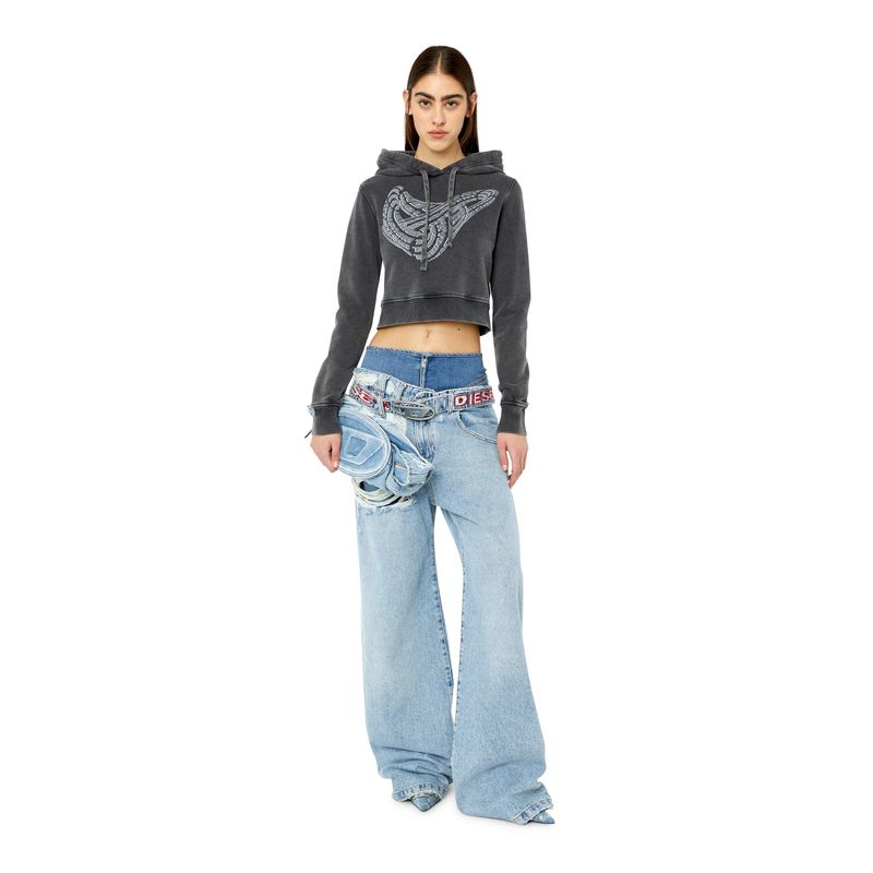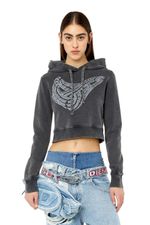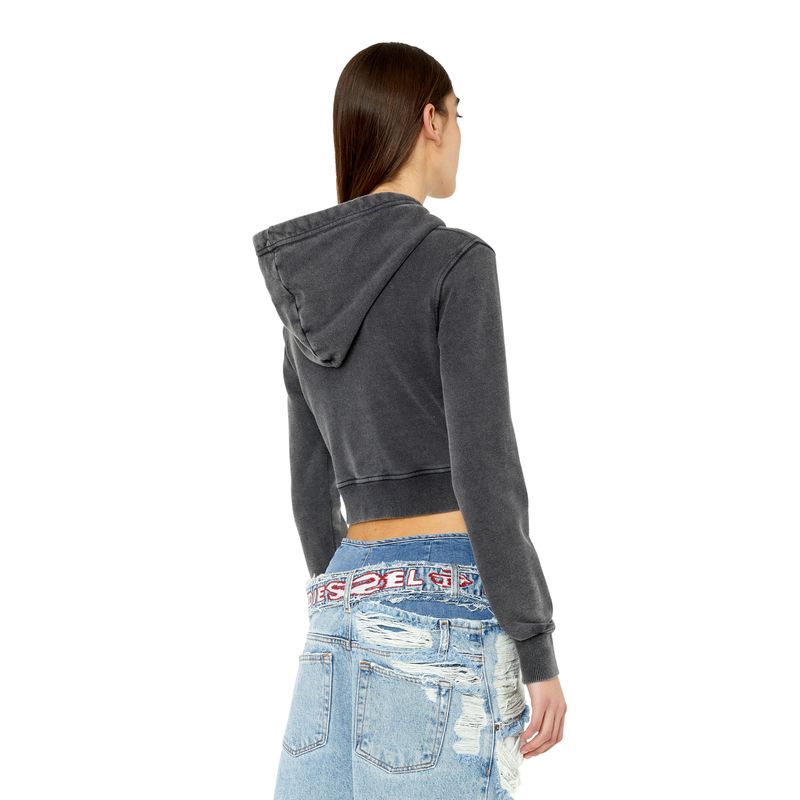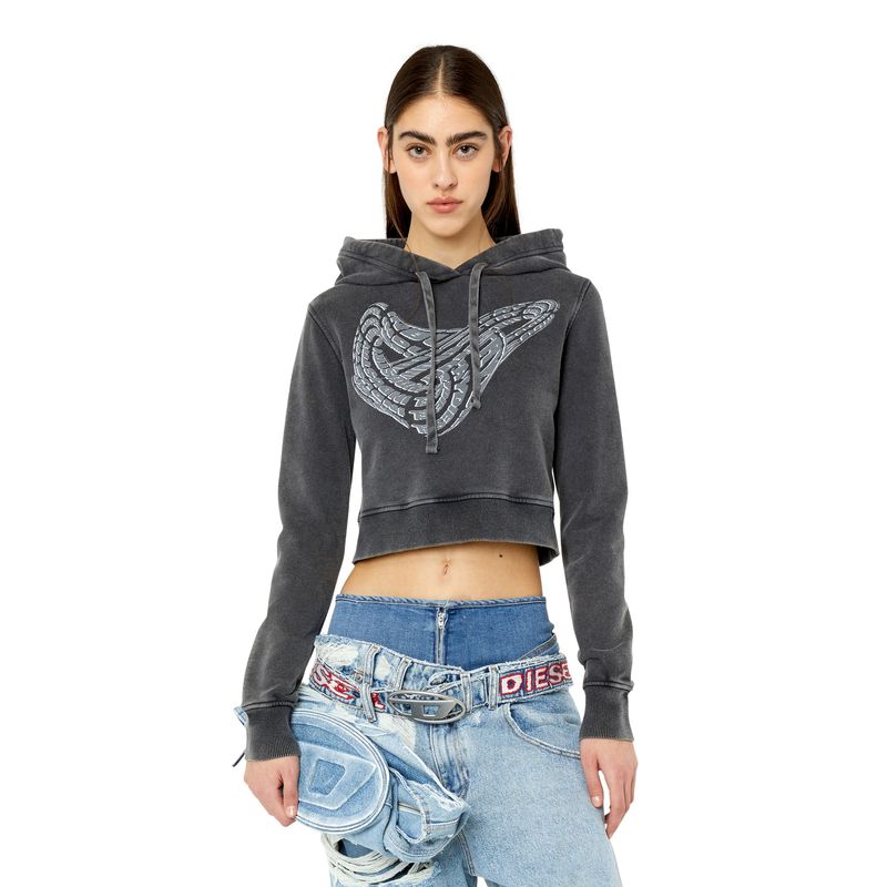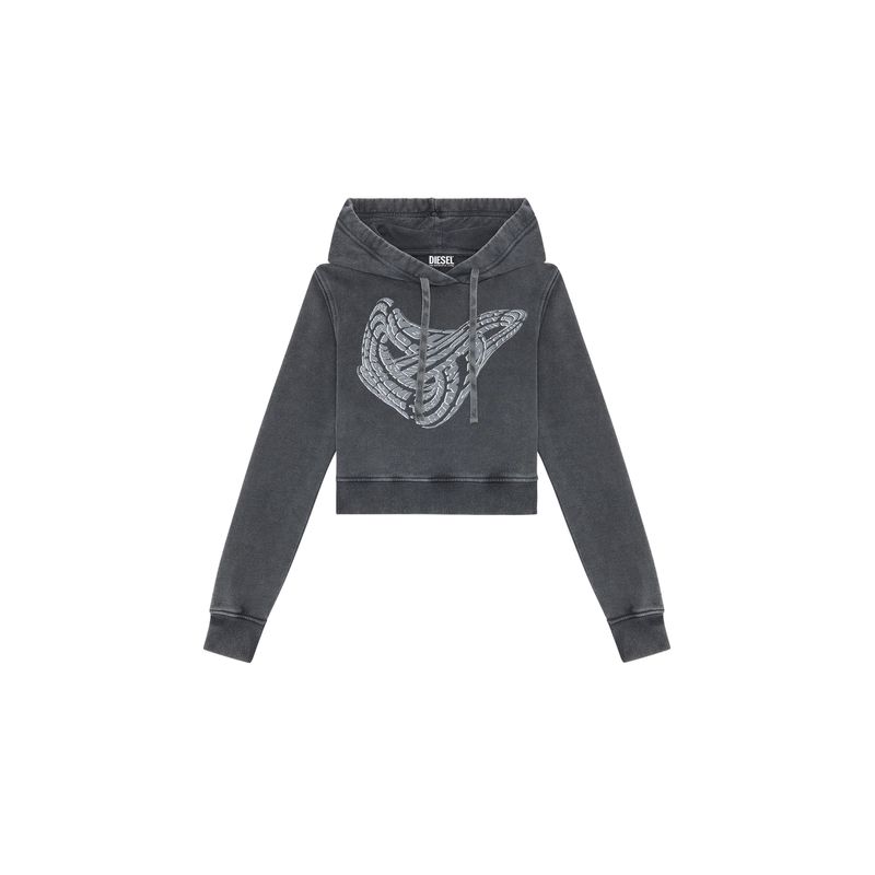 Sudadera con capucha para mujer de fit entallado y tejido de algodón. El pecho tiene un gráfico de anillo Diesel Industry estampado. Está teñida en prenda y lavada a la piedra para lograr un sutil efecto despegado. Corte ajustado