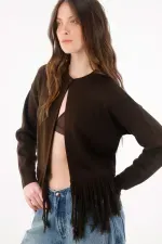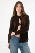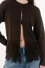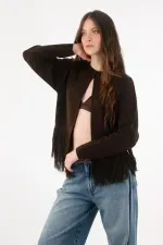 Fit & Styling Silueta relajada de hombro caído y largo a la cadera. Llévalo semiabierto sobre un top al cuerpo en tono chocolate y un jean recto de tiro alto; remanga levemente las mangas para equilibrar proporciones y deja que los flecos marquen el movimiento, ideal para el entretiempo y la vida en la ciudad.