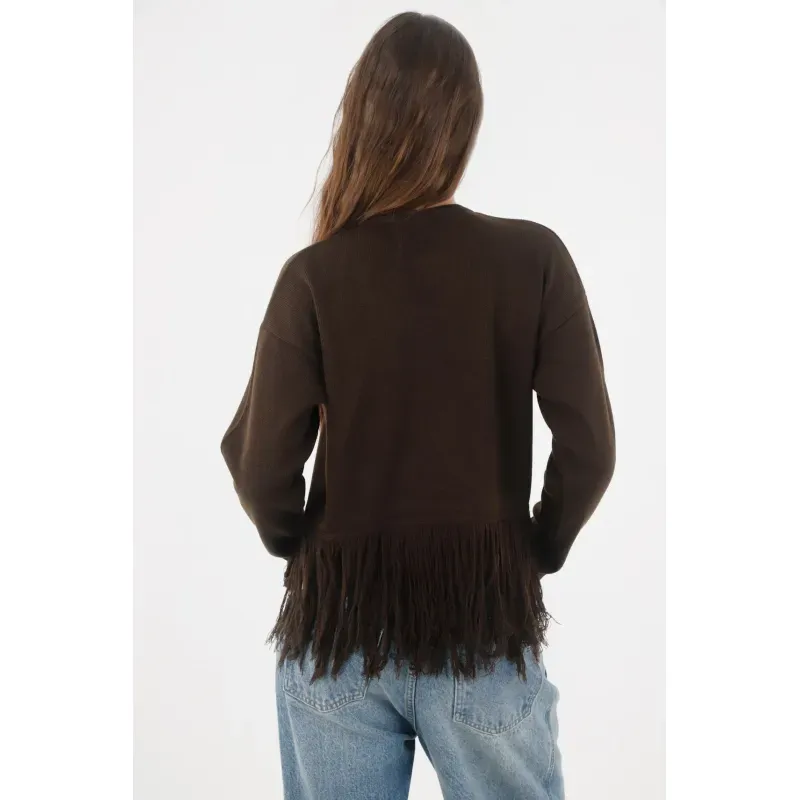 Flecos que se mueven contigo. Un guiño de ritmo urbano en un buzo de punto entero que convierte cada paso en actitud. El acrílico suave abraza sin pesar y mantiene la forma, perfecto para días dinámicos. El bajo con flecos largos suma textura y personalidad, creando una caída que estiliza al caminar. El cuello redondo con botón único te deja jugar: abierto para aire de cárdigan, cerrado para un look limpio. El tono café profundo aporta calidez y combina fácil con denim y neutros.