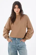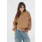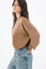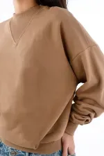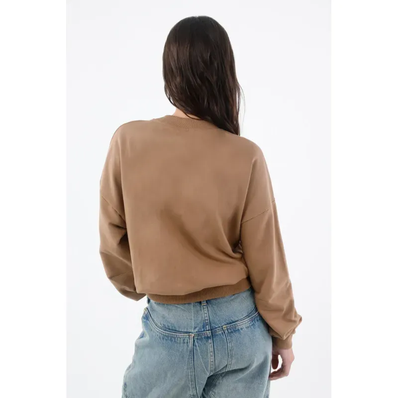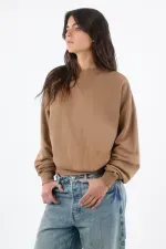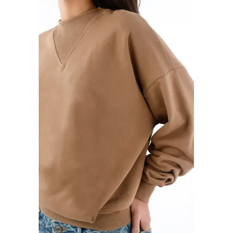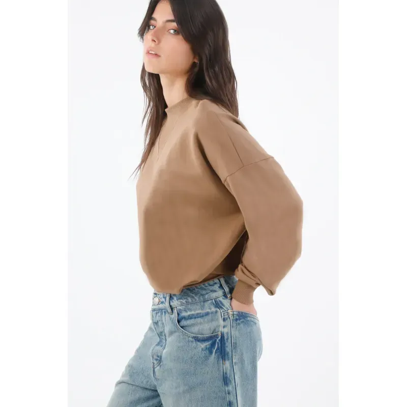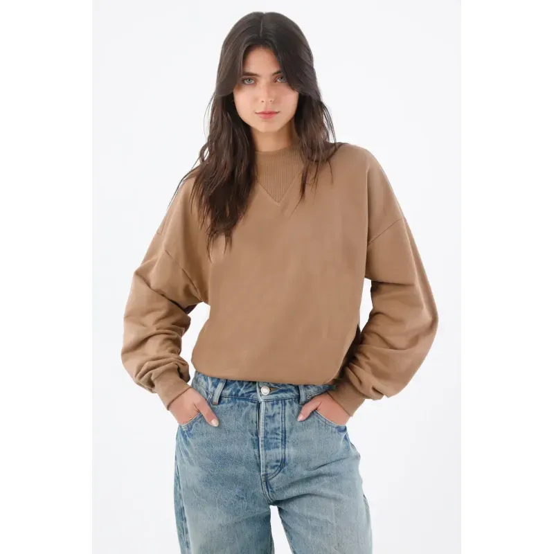 Este buzo de mujer en algodón apuesta por líneas limpias y un detalle que lo hace único: el triángulo acanalado en el cuello redondo, un guiño deportivo que ordena la zona y suma textura sutil. El hombro caído y las mangas amplias crean un fit relajado con caída natural, perfecto para moverte por la ciudad con estilo. El largo a la cintura y los ribetes acanalados en puños y ruedo definen la silueta y mantienen el look pulido. El color camel sólido es versátil y cálido, ideal para combinar con tonos neutros y denim.