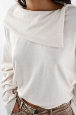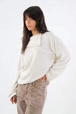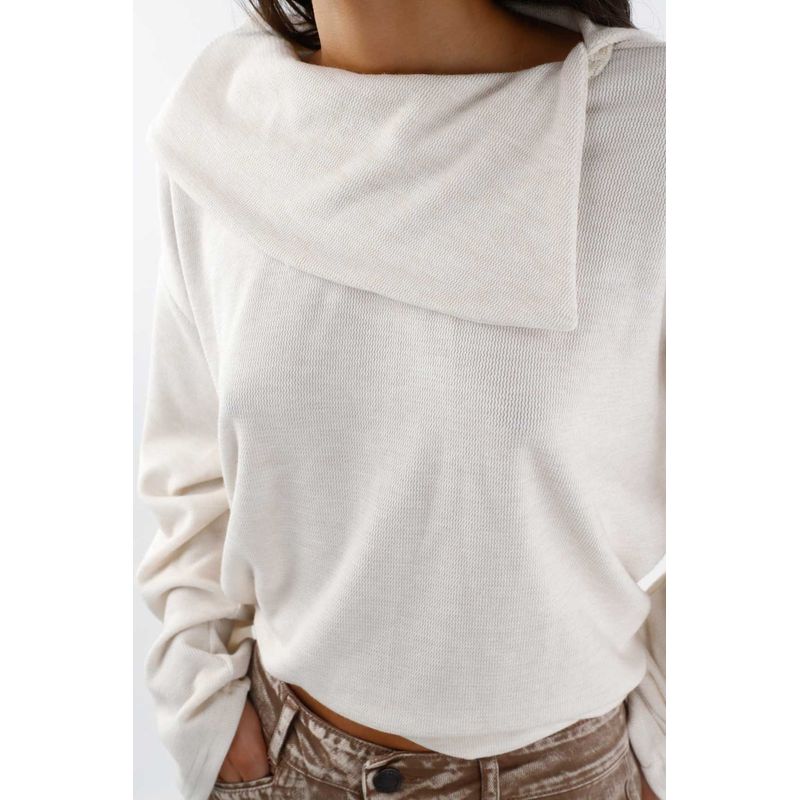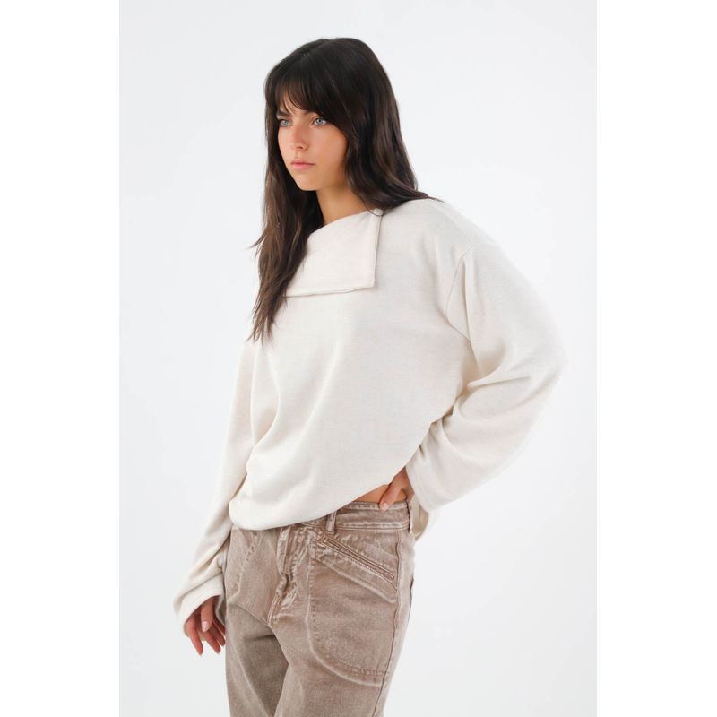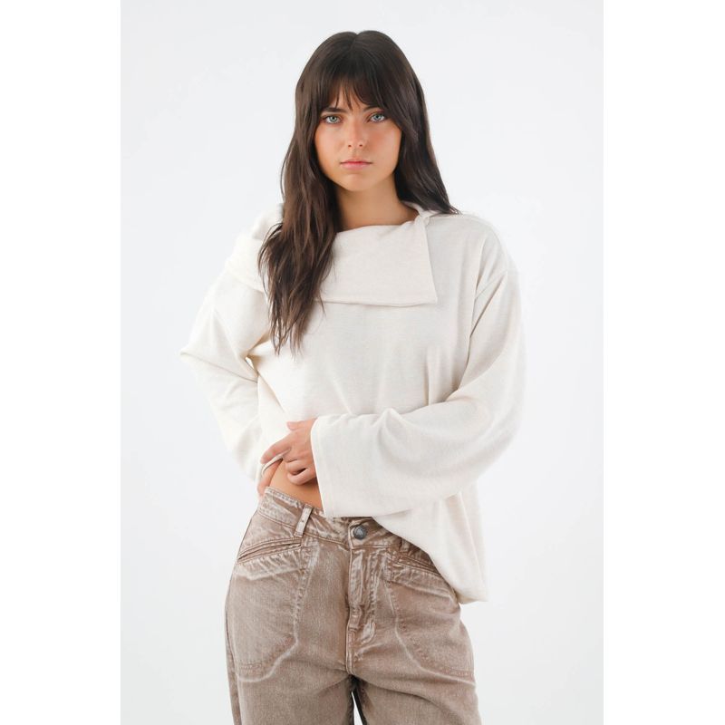 Minimalista pero con carácter, TNS presenta un buzo de punto para mujer en color marfil que centra la atención en su pieza superior envolvente. Ese panel en el cuello crea un efecto arquitectónico que enmarca el rostro y suma presencia sin esfuerzo. El tejido de poliéster con viscosa y un toque de elastano ofrece una caída limpia y cómoda que acompaña el movimiento. Las mangas amplias y el hombro caído construyen una silueta relajada y moderna, rematada por un bajo recto para un acabado pulcro y urbano.
