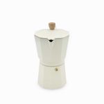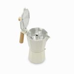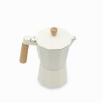 Cafetera Moka de color blanco y madera, con un encantador estilo vintage inspirado en las tradicionales cafeteras italianas. Su diseño en aluminio, combinado con un elegante mango de madera, le da un toque distintivo. Con capacidad para 9 tazas 450 ml, es la opción ideal para preparar café.