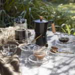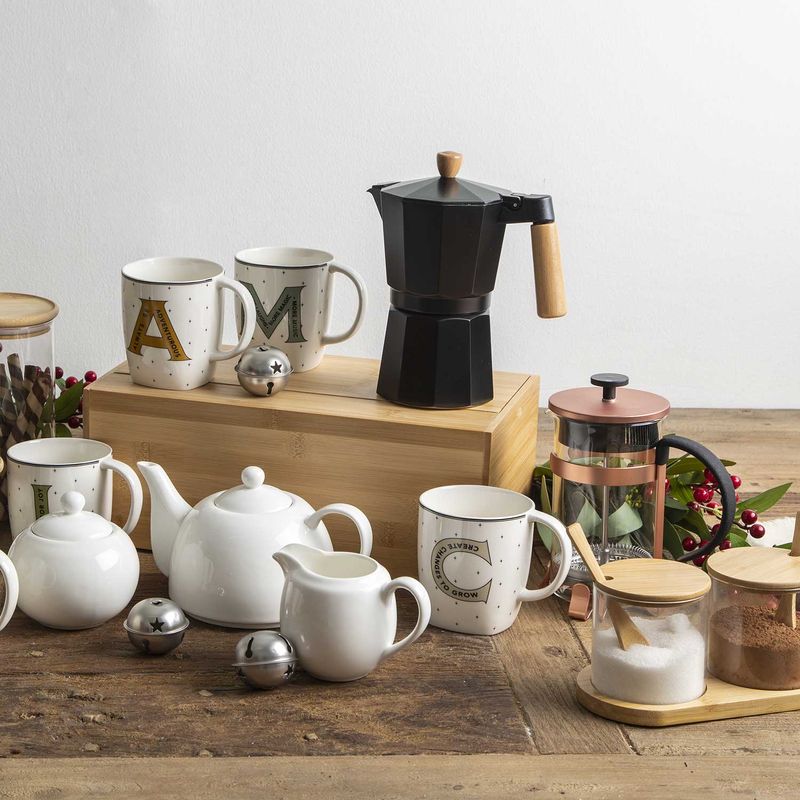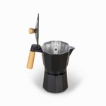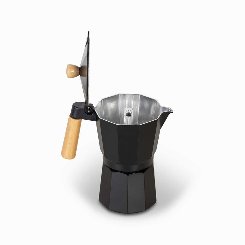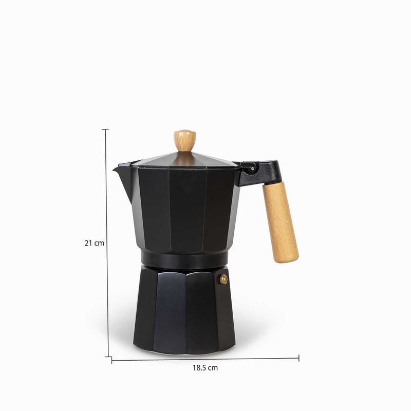 Cafetera Moka de color negro cromado y mango en madera, con capacidad para nueve tazas, es una opción clásica y popular para preparar café oscuro y fuerte, similar al espresso. Fabricada en aluminio y polipropileno, esta cafetera combina durabilidad con un diseño inspirado en la tradicional olla italiana. Para preservar su sabor auténtico, se recomienda limpiarla únicamente con agua caliente y un paño de cocina, evitando el uso de jabón o limpiadores abrasivos que podrían dejar un sabor metálico en el café.