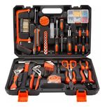 del hogar y proyectos de bricolaje. Viene con un martillo, un juego de destornilladores, alicates, pelacables, llaves combinadas, llaves de trinquete, enchufes, llaves hexagonales, minisierra, cinta métrica y brocas de destornillador, etc. Todas las herramientas cumplen o superan el estándar ANSI.