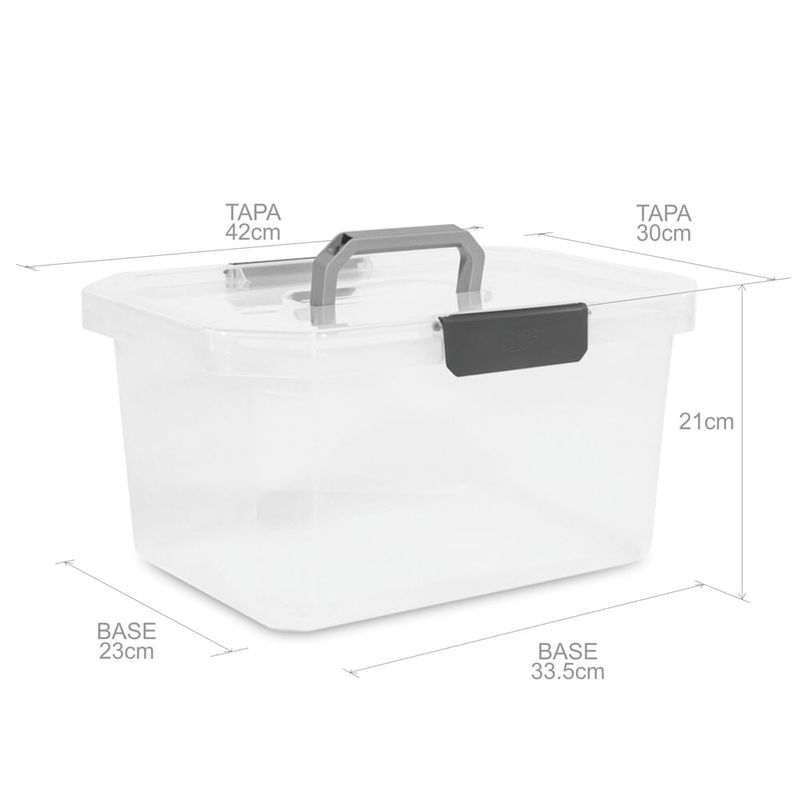 Caja organizadora de 16L con broches y tapa con manija logrando que todos tus objetos estén siempre protegidos y almacenados en un solo lugar, dando orden a todos los espacios de tu casa y oficina. Su cuerpo y tapa transparente facilitan ver su contenido, mientras ahorras y maximizas tus espacios para tener todo a la mano en cualquier instante. Su disen~o y forma curveada en las esquinas hace que el producto sea más resistente. Ideales para mantener el orden en toda la casa: habitaciones, patio, cocina, y dema´s a´reas del hogar. Por su disen~o permiten ser complementadas con cajas de otras capacidades aplilandolas entre si.