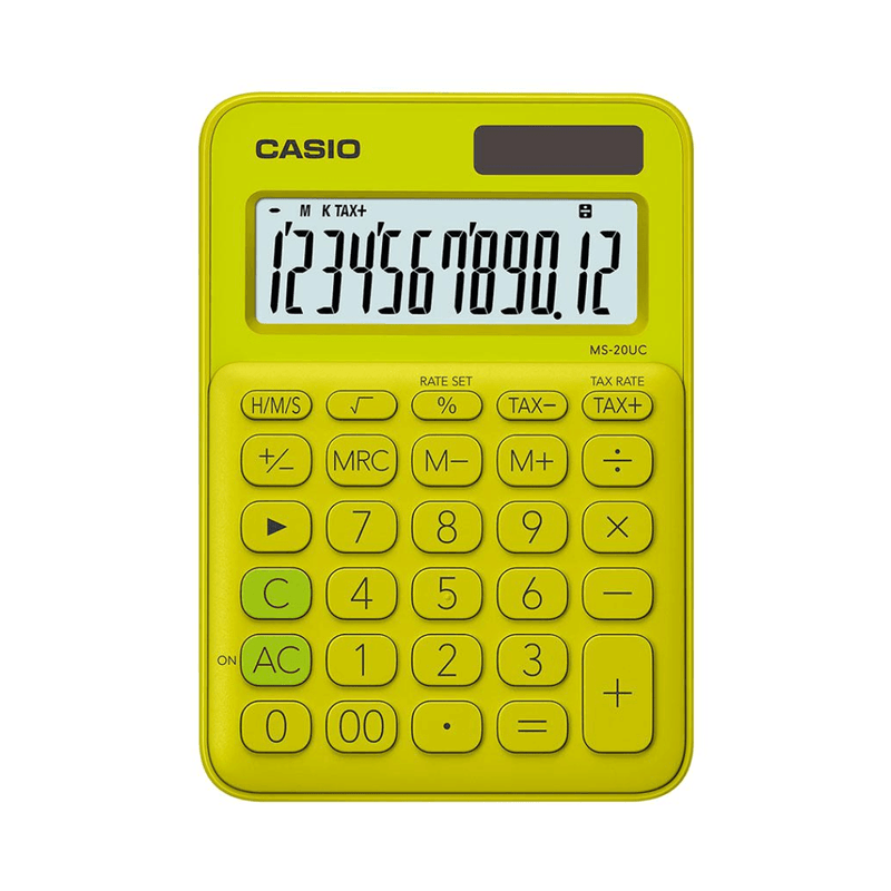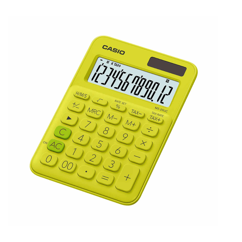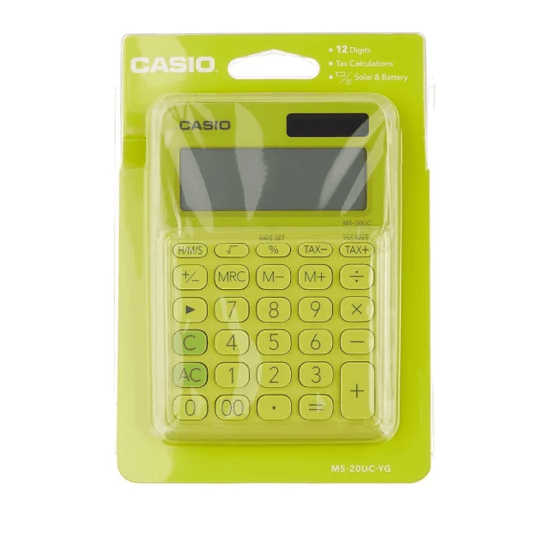 • Calculadora básica de 12 dígitos • Pulsación simultánea de teclas • Pantalla extra grande • Teclas plásticas • Fuente de alimentación: batería / energía solar •Cálculo de impuesto: Cálculo y resultado automática del precio más el impuesto, precio menos el impuesto, descuento, precio de venta, importe de impuesto, importe de descuento e importe de margen de ganancia. Cálculo de tiempo: El cálculo de tiempo le permite ingresar y calcular fácilmente los valores en hora, minutos y segundos.