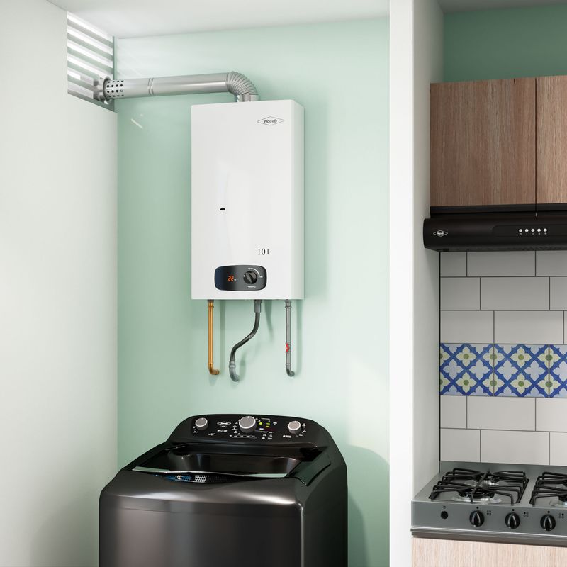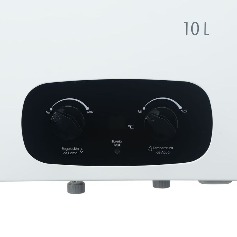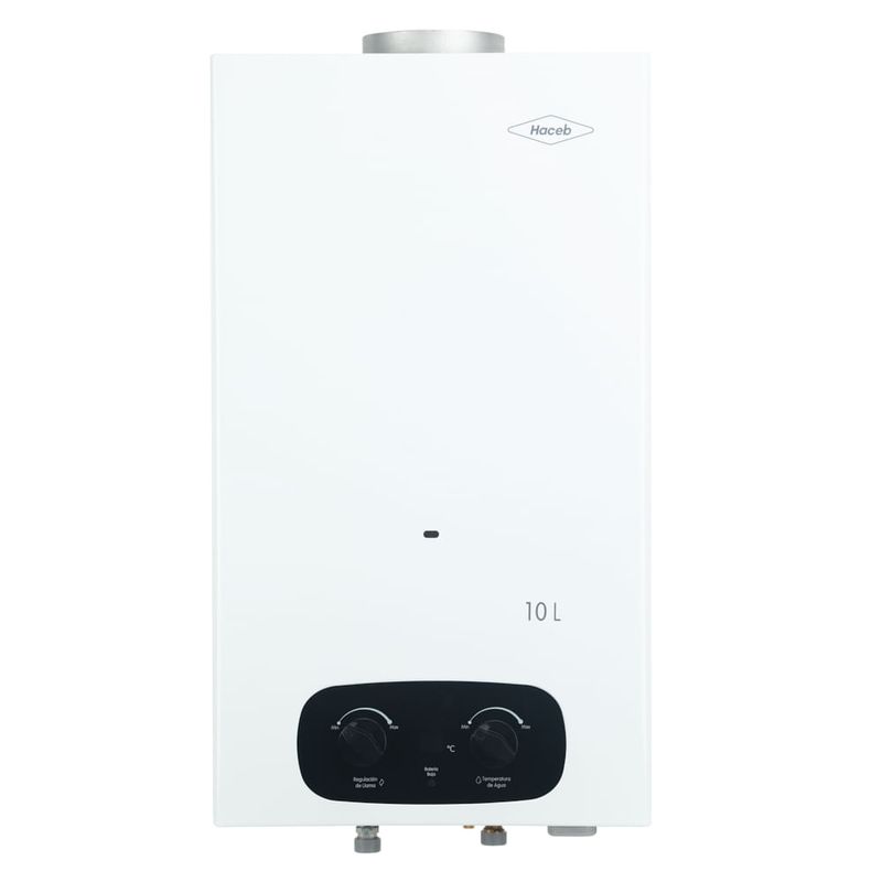 Calentador de paso a gas natural 10 litros Tiro Natural, ideal para uso de diversas salidas de agua. Se enciende de manera automática con solo abrir la llave y puedes ajustar la temperatura del agua facilmente girando las manijas de control de flujo de agua y de gas. Gracias a su diseño delgado, tamaño compacto y apariencia moderna podrás tener el confort y estilo en tu hogar. Con intercambiador 100% cobre lo que se traduce en mayor eficiencia, vida útil y confiabilidad del equipo.