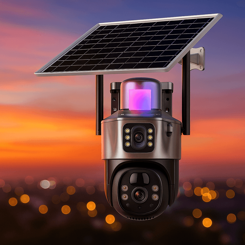 Energía solar que mantiene la cámara cargada con luz directa, reduciendo el consumo eléctrico.