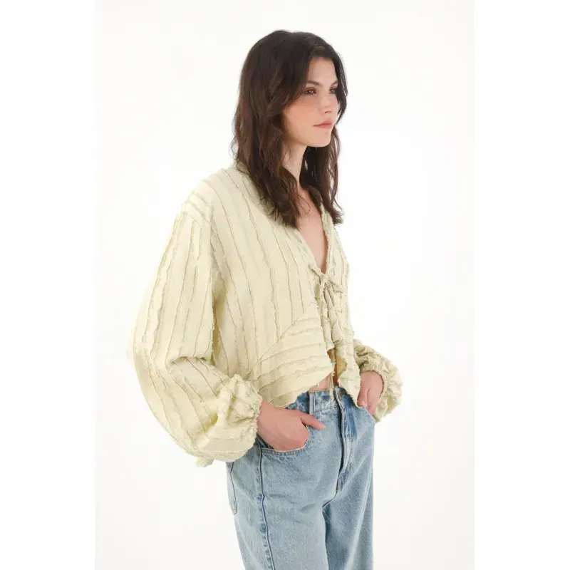 Esta camisa amplia para mujer está pensada para quienes buscan comodidad sin renunciar al estilo. Su silueta suelta permite una caída natural y ligera, mientras que la tela con textura le aporta profundidad visual y un aire sofisticado. El diseño del frente en V invertida estiliza la figura y se complementa con una tira para amarrar en el frente, un detalle funcional y decorativo que permite ajustar la prenda y jugar con diferentes formas de uso. Las mangas largas con elástico en los puños aportan volumen sutil y comodidad, creando un equilibrio perfecto entre lo relajado y lo femenino. Es una prenda ideal para adaptar fácilmente a looks casuales o más pulidos según cómo se combine.