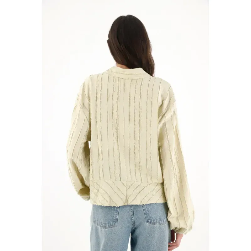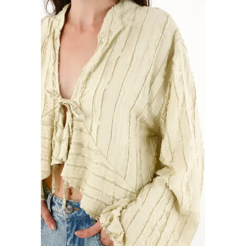 Esta camisa amplia para mujer está pensada para quienes buscan comodidad sin renunciar al estilo. Su silueta suelta permite una caída natural y ligera, mientras que la tela con textura le aporta profundidad visual y un aire sofisticado. El diseño del frente en V invertida estiliza la figura y se complementa con una tira para amarrar en el frente, un detalle funcional y decorativo que permite ajustar la prenda y jugar con diferentes formas de uso. Las mangas largas con elástico en los puños aportan volumen sutil y comodidad, creando un equilibrio perfecto entre lo relajado y lo femenino. Es una prenda ideal para adaptar fácilmente a looks casuales o más pulidos según cómo se combine.