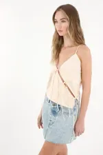 Camisa confeccionada en 100% algodón, con silueta ligera, abertura diagonal con tiras para ajustar, y escote en V que realza la forma natural. Su tono crudo la convierte en una base esencial y versátil para cualquier ocasión.