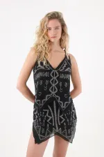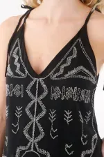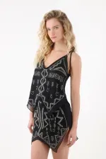 Está elaborada en tela bordada, un material liviano y delicado que ofrece una caída suave y un acabado elegante, ideal para looks frescos y con un toque glamuroso.