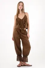 Confeccionada en una tela de apariencia lino, liviana y con caída suave, resalta por sus piezas decorativas y el movimiento sutil de los boleros en blonda que añaden un toque romántico y artesanal.