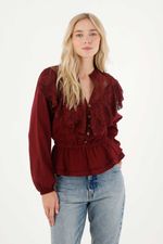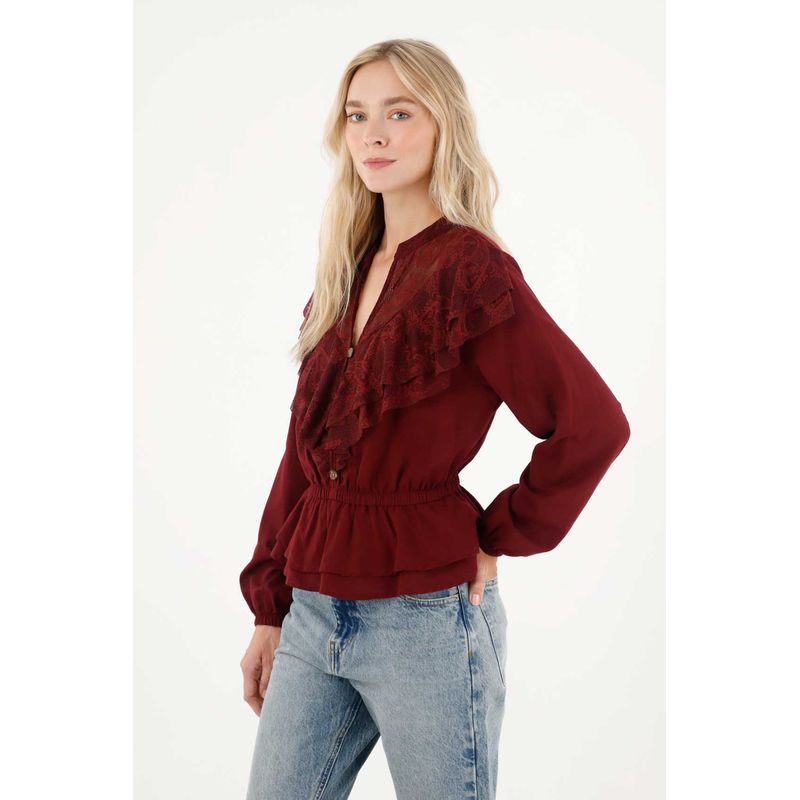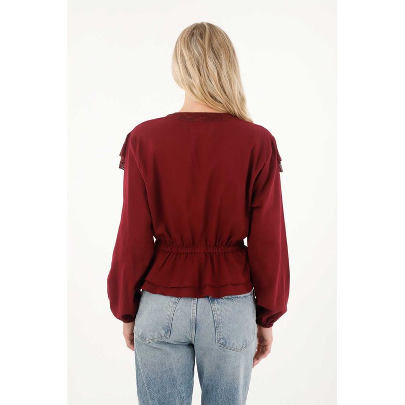 Confeccionada en encaje y tela ligera para equilibrar suavidad con un fit que estiliza. El encaje en frente y el escote en V resaltan la feminidad, mientras que la manga larga y la perilla de botones crean un contraste entre lo delicado y lo versátil. El corte con elástico y bolero en ruedo suma movimiento y versatilidad que van muy bien con jeans o con pantalones.
