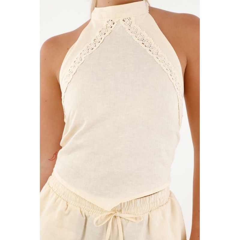 ¡Una camisa fresca, femenina y llena de detalles que hacen la diferencia! Esta camisa para mujer es la compañera perfecta para looks ligeros y sofisticados, especialmente cuando se usa en conjunto con su short en set. Su diseño incorpora un delicado detalle tipo encaje en el frente y un ruedo delantero en punta que aporta movimiento y un aire más estilizado. El escote en la espalda con nido de abeja y el amarre en el cuello crean un toque romántico y artesanal, ideal para combinar con prendas en tonos naturales o accesorios tejidos para un outfit auténtico y veraniego. Está elaborada en una mezcla de lino lino y algodón, una combinación fresca, suave y transpirable que se siente ligera sobre la piel. El nido de abeja en la parte posterior asegura un ajuste cómodo y flexible, mientras que los acabados artesanales realzan su estética cuidada. Sobre la colección: Hace parte de nuestras prendas inspirdas en el verano, los detalles hechos a mano y la energía especial de los días cálidos de fin de año.