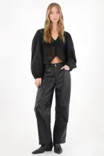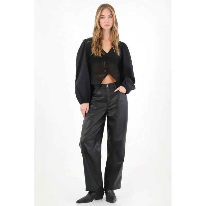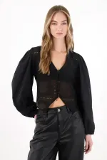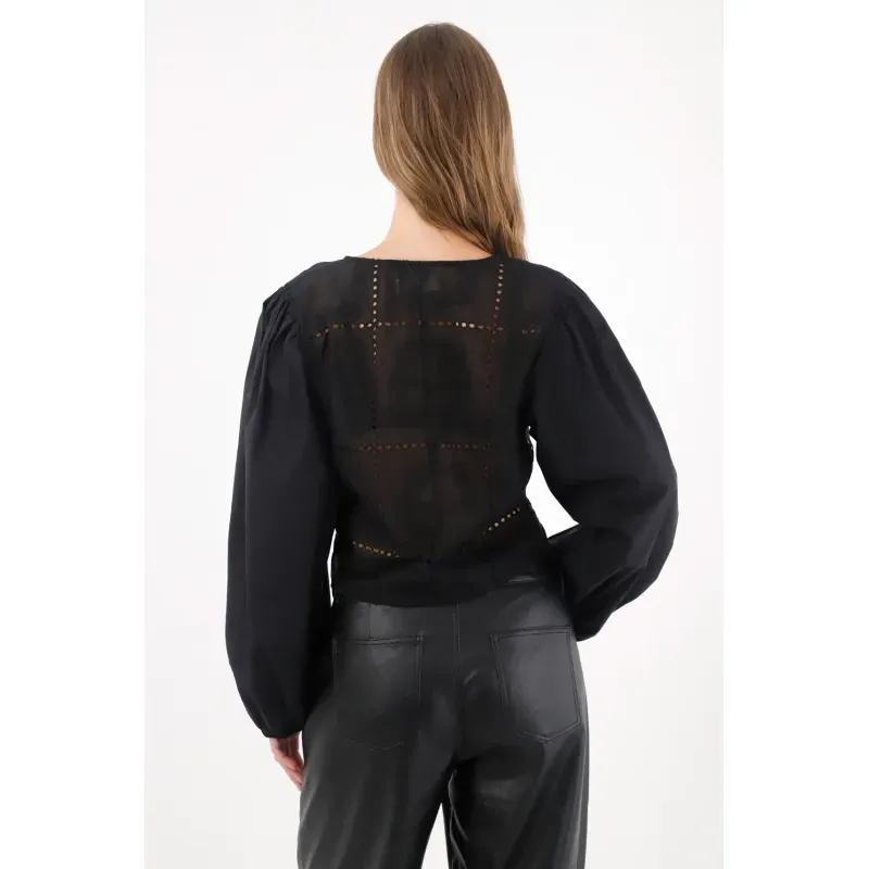 Su diseño combina bordados sutiles y transparencias suaves que revelan una feminidad auténtica. Las mangas en 100% algodón equilibran textura y frescura, mientras el escote en V y los frunces elásticos en frente aportan una silueta romántica y relajada.
