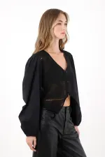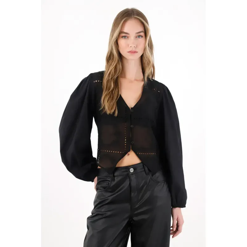 Camisa en tela liviana con transparencias, bordados decorativos, botones frontales, manga larga con puños elásticos y detalles en algodón puro que aportan suavidad y estructura.